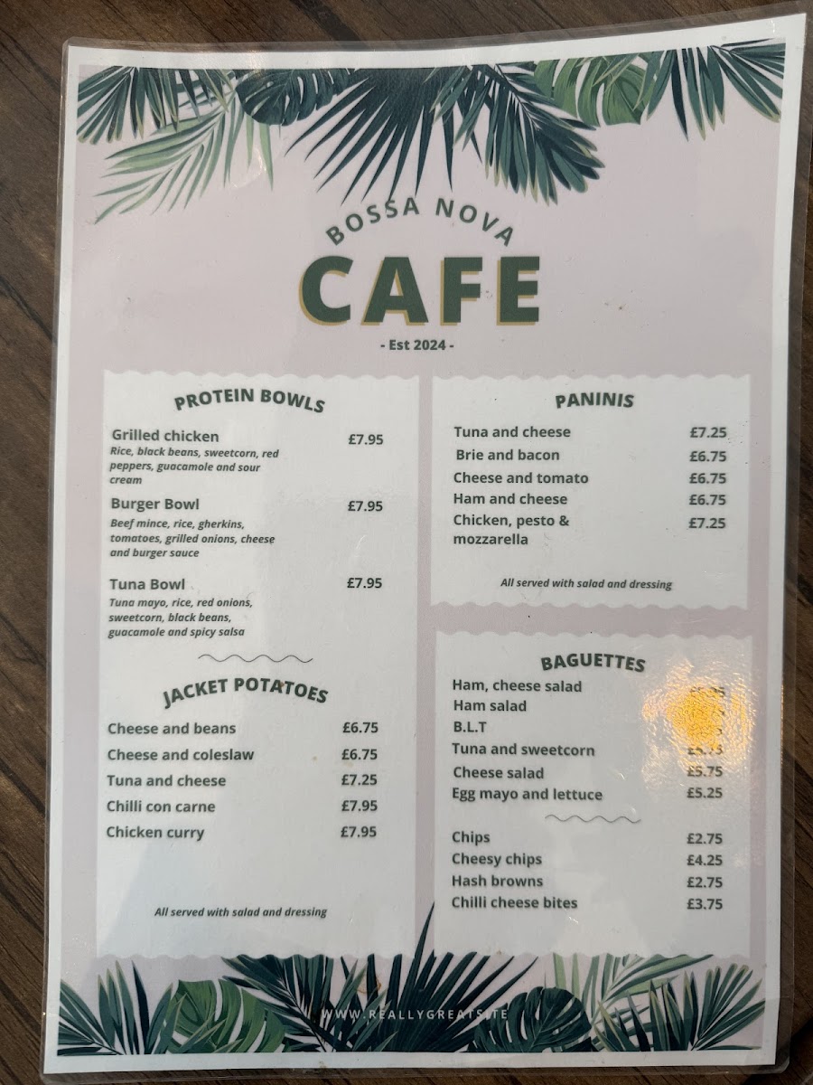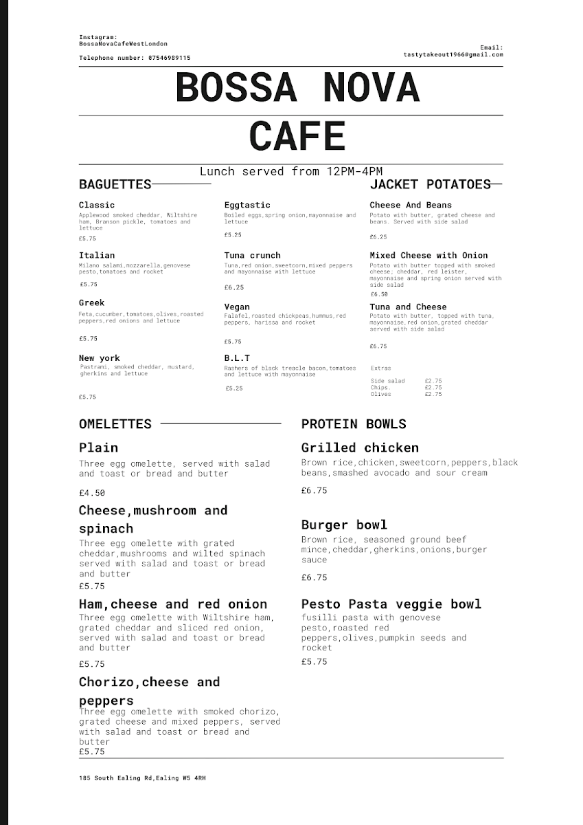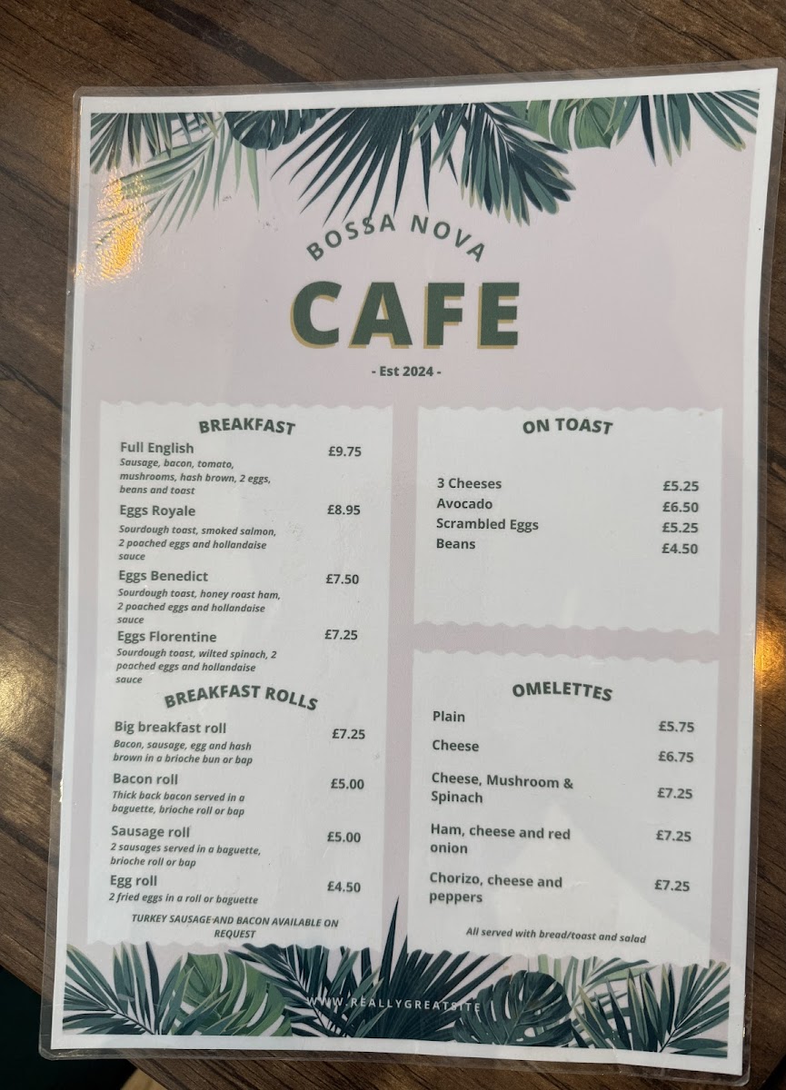 The menu at Bossa Nova Cafe offers a variety of options suited for breakfast, light meals, and casual dining throughout the day. It features a selection of breakfast dishes including classics such as Full English, Eggs Royale, Eggs Benedict, and Eggs Florentine.